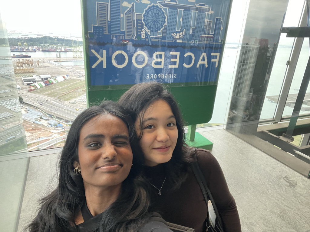 To end this blog post, here’s a photo of my friend and I @ Meta Office, Singapore – we had a cute little tour around the place as part of a extra-curricular trip by United Women Singapore, and I don’t think we’ve ever been happier to see “Hello World” than on a huge structure within their office. (My dear friend also swears to watch The Social Network once her exam season is over, and rest assured I will be chiding her to do so)